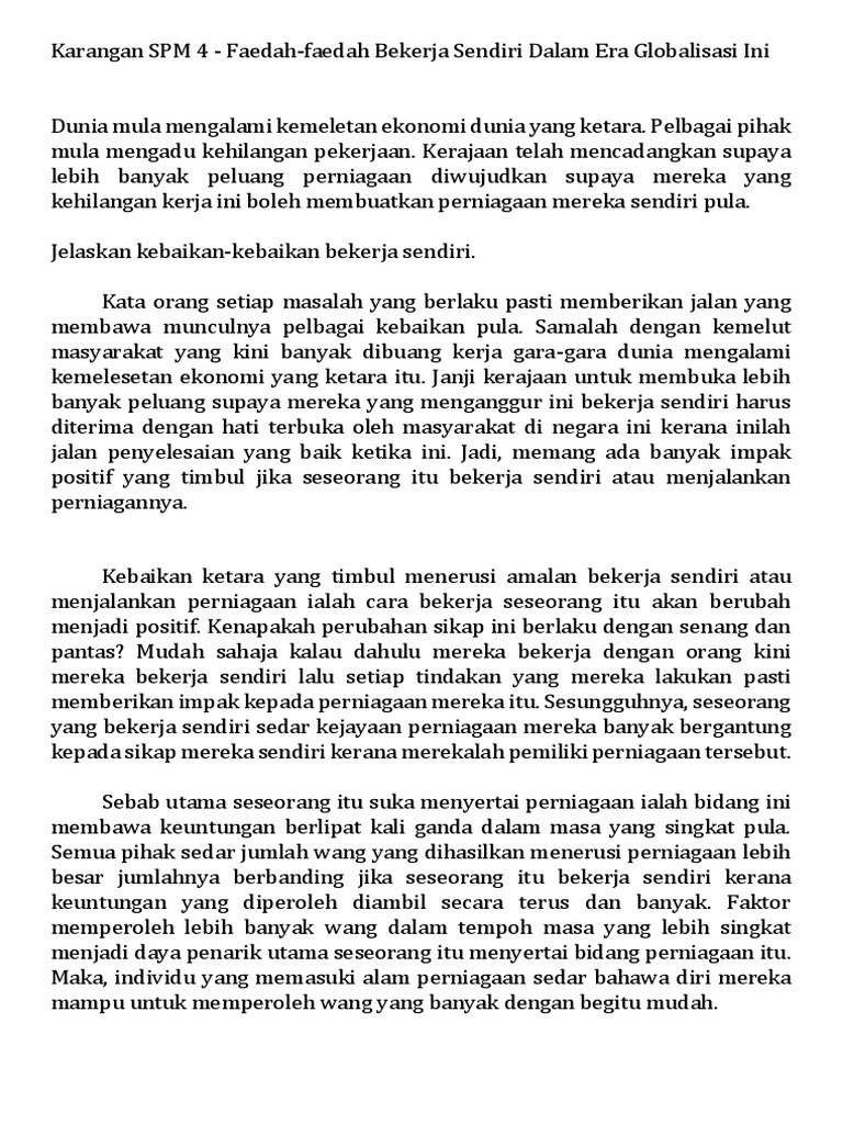 Contoh Karangan Kebaikan bekerja sendiri Contoh Karangan Bahasa Malaysia PT3 Kandungan Faedah-faedah bekerja sendiri dalam era globalisasi Perubahan sikap menjadi. UNSUR NILAIMENDIDIK PEMBACA Bulat air kerana pembetung bulat manusia kerana muafakat UNGKAPAN MENARIK marilah kita mengatur langkah sederap seia sekata agar. Contoh Karangan Bahasa Malaysia SPM Kandungan Kepentingan Unit Bimbingan dan Kaunseling Sekolah Menyediakan khidmat nasihat kepada pelajar Sumber maklumat berkaitan.
